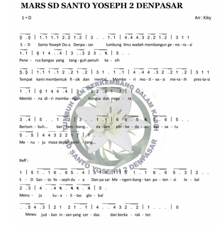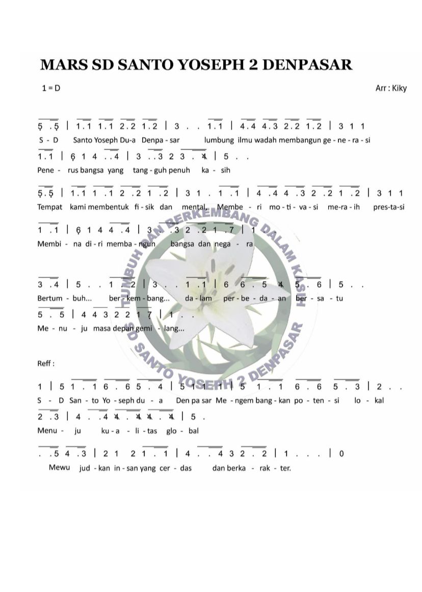 Di sekolah kami, lagu-lagu bukan sekadar rangkaian nada, tetapi bagian penting dari pembentukan karakter dan identitas siswa. Setiap pagi, anak-anak menyanyikan Mars SD Santo Yoseph 2 Denpasar dengan penuh semangat. Lagu ini menjadi pengingat bahwa mereka adalah bagian dari komunitas yang berjuang bersama, belajar bersama, dan bertumbuh dalam kasih. Melalui mars ini, anak-anak belajar tentang kebanggaan, disiplin, dan rasa memiliki terhadap sekolah.